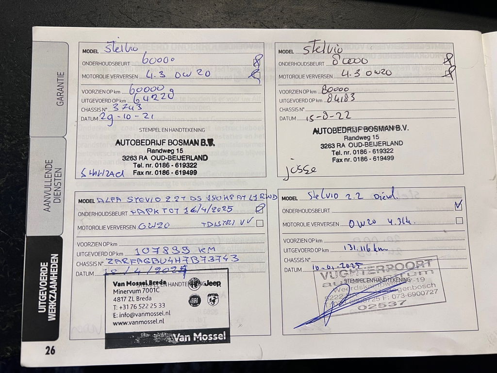 Fabrikant: Vughterpoort auto's Weerdskampweg 1719 5222BA 'S-HERTOGENBOSCH, NL 0736900725 http://www.vughterpoortauto.nl info@vughterpoortauto.nlStelvio 2.2 JTD 180pk diesel, Euro 6 milieuzoneproof! heerlijke 8-traps automaat, Mooie combi "Grigio stromboli-metallic & cognac half-lederen interieur, groot wide-screen navi+camera, Bi-Xenon lampen, Cruise, camera +parkeersensoren V+A, elektrische achterklep, 3x USB poort, Afneembare trekhaak (1700kg). onderhoudshistorie aanwezig, Origineel NL auto, geen import. Distributieriem vervangen bij 107.000km. Wij bieden u diverse onderhouds/extra garantiepakketten.