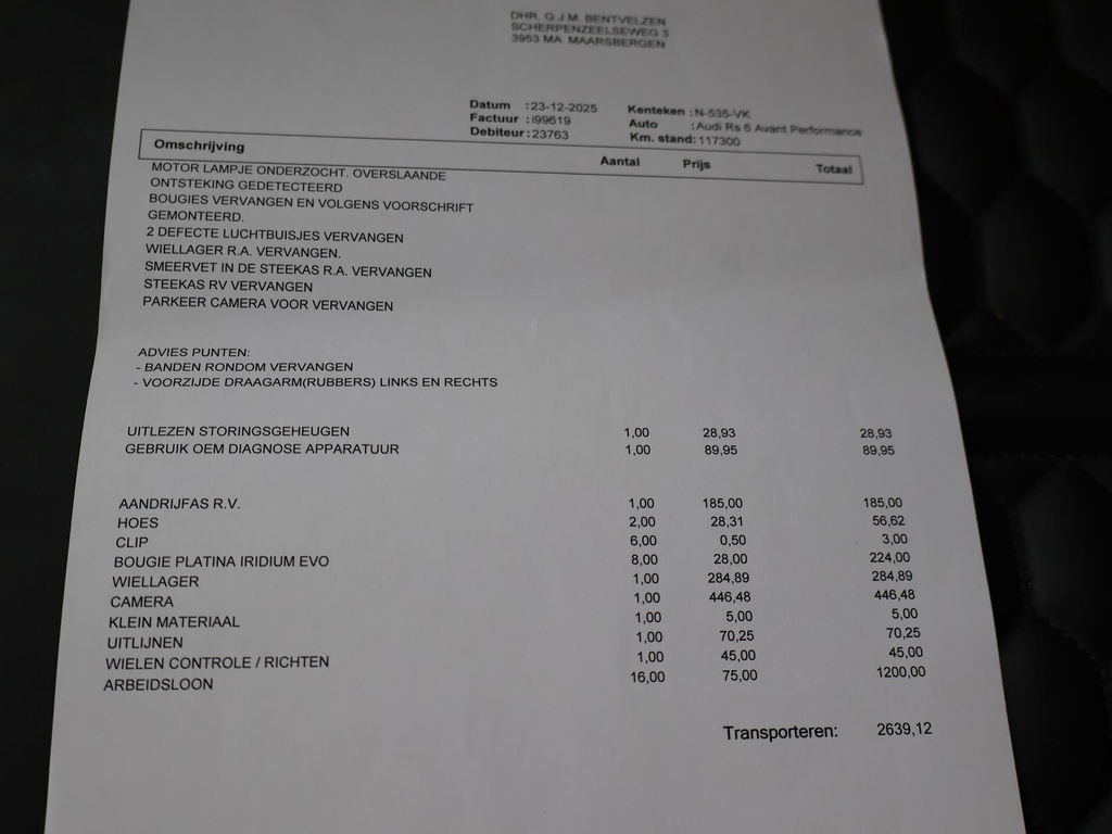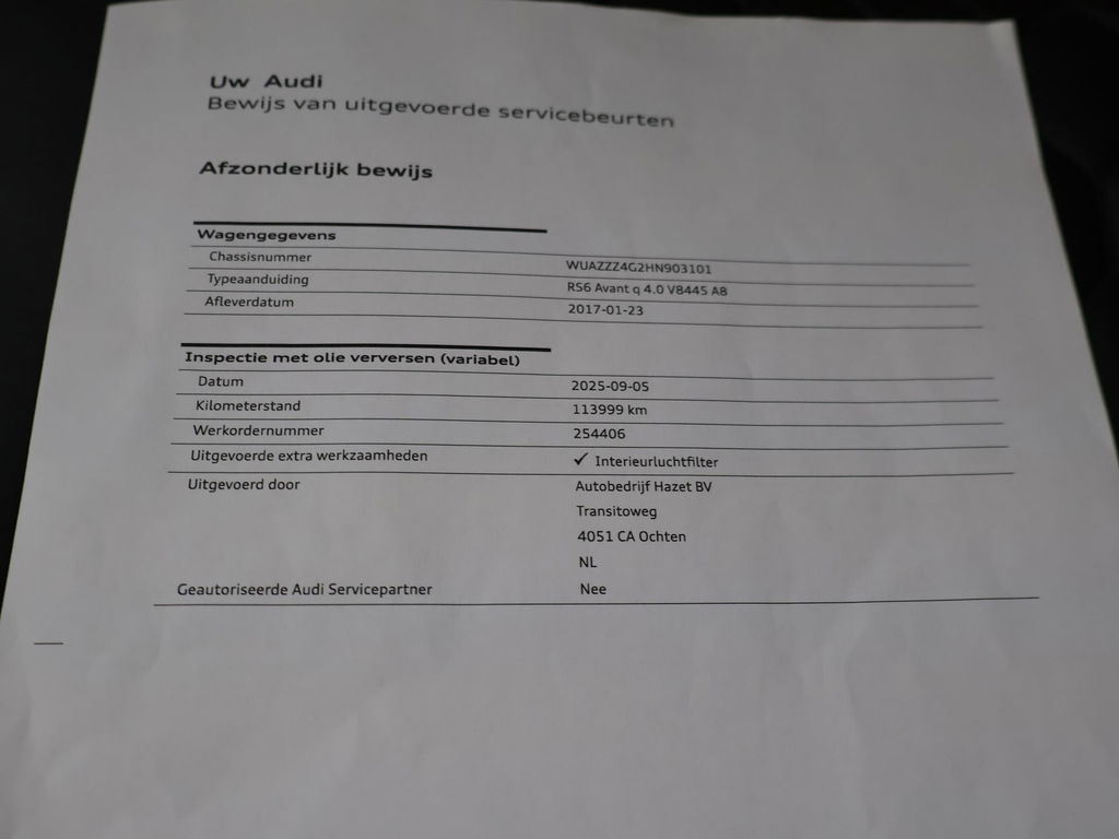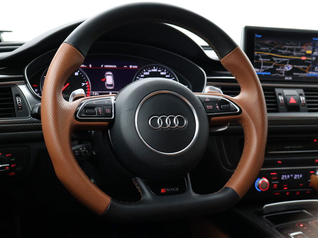 EU verantwoordelijke: Audi AG Auto-Union-Straße 1 85057 Ingolstadt, NL 0800-28347378423 https://www.audi.de/de/ kundenbetreuung@audi.deAudi RS6 4.0 TFSI V8 Bi-Turbo Performance met 605 PK vermogen en Quattro vierwielaandrijving, Audi Ceramic Brakes dus Keramische remmen, Audi Exlusive interieur met exclusive bi-color leder interieur + stoelen + middentunnel leder, Bang & Olufsen High End audio, Carbon interieur + exterieur styling, Carbon diffuser achterbumper, Carbon dashboard inleg, Carbon middentunnel, Privacy glass, 360 graden rondomzicht camera, Cruise control, 4-zone climate control, Zwarte alcantara hemelbekleding, LED koplampen, LED achterlichten, Elektrische achterklep, Keyless-entry en keyless-drive, Elektrische stoelverstelling met geheugen, Zwarte grille en logo's rondom, Achterspoiler, in 09-2025 bij 113.999 km nog onderhoud gehad.