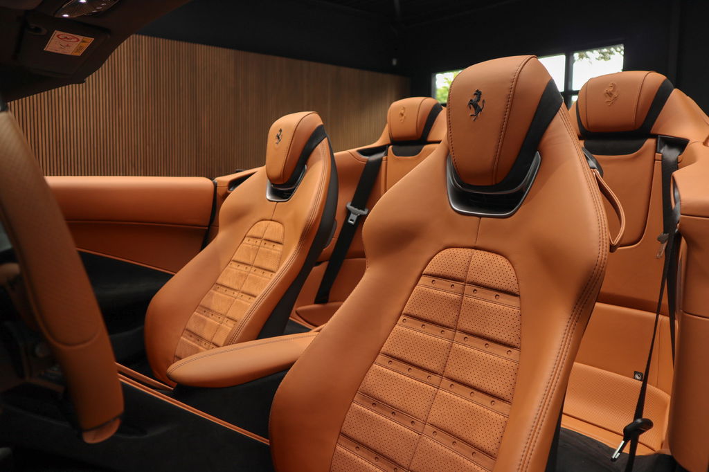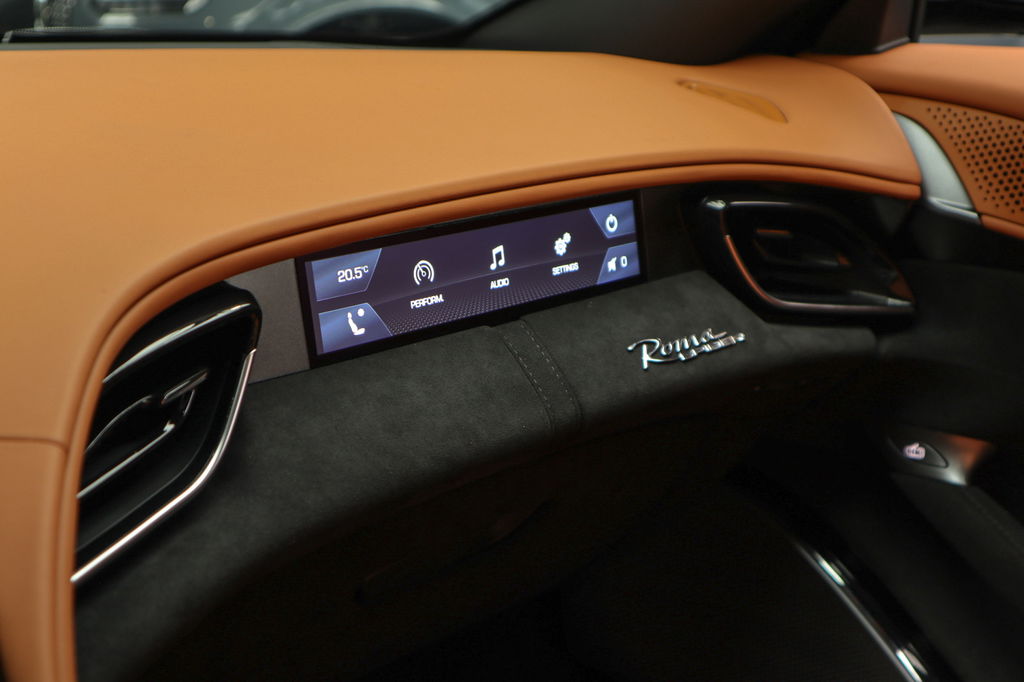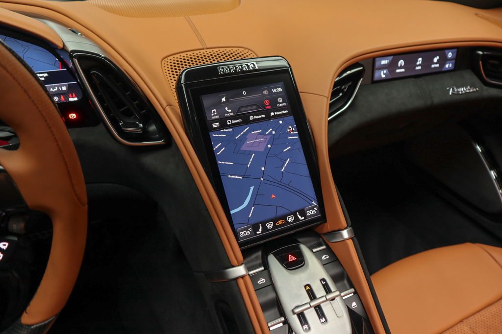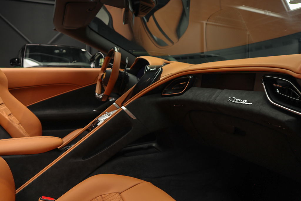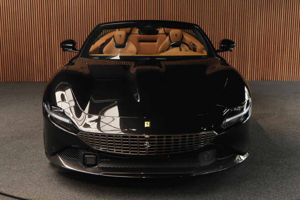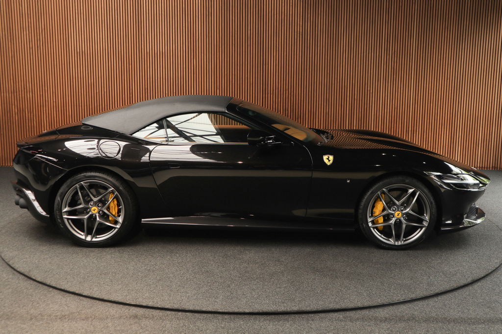 Deze prachtige en nieuw samengestelde Ferrari Roma spider in kleur zwart metallic ( Nero ) gecombineerd met de kleur interieur kleur Cuoio heeft een bijzondere kleuren combinatie.