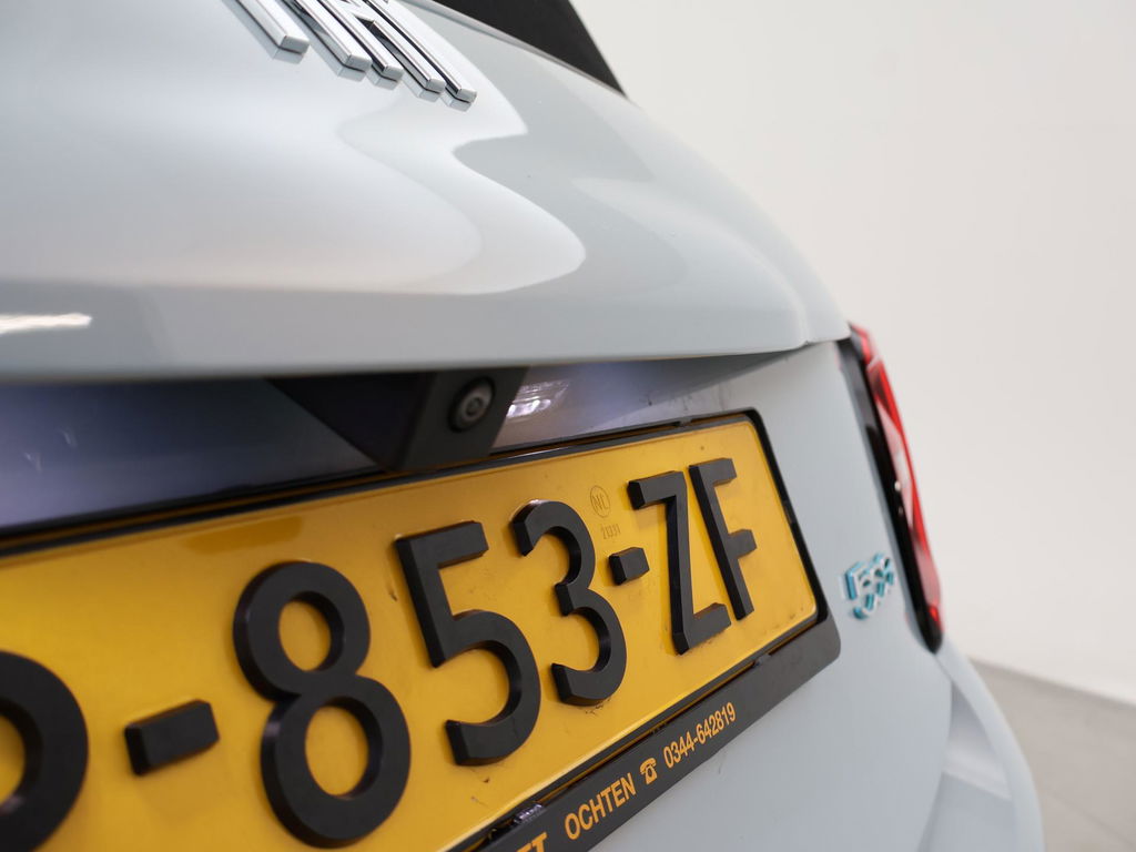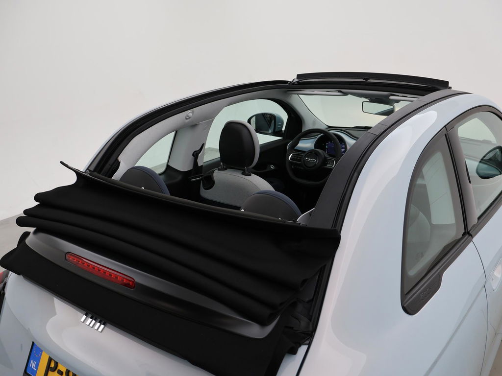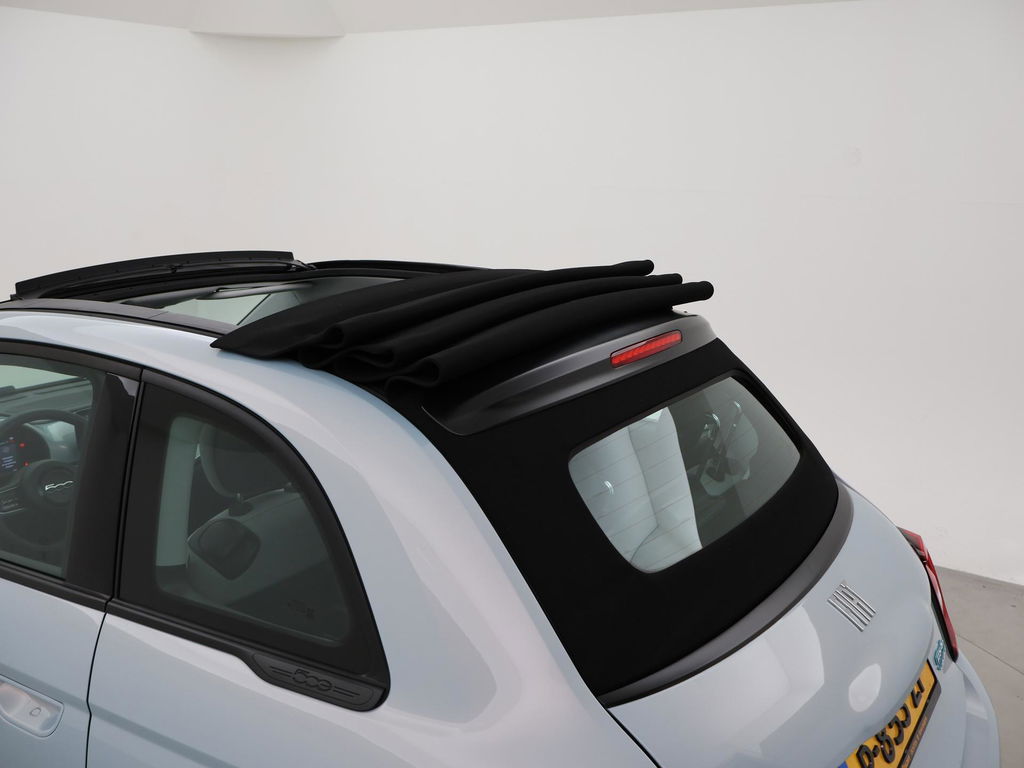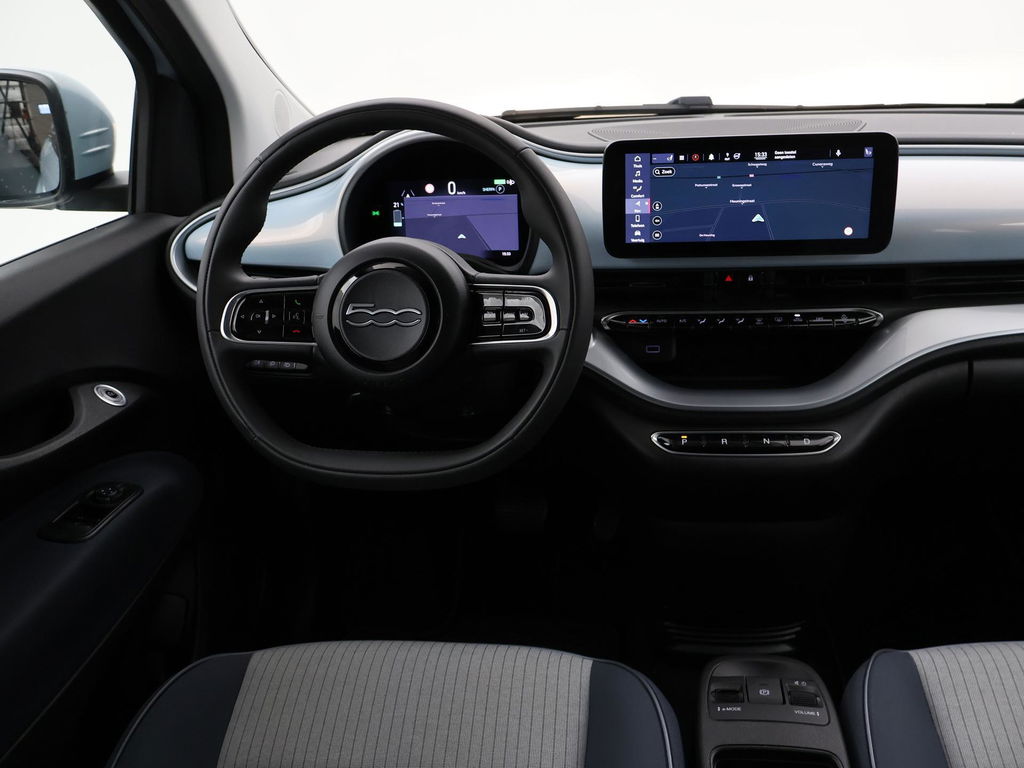 Fiat 500e cabrio / 500C 42 kWh in de super gave kleur Celestial Blue, Zeer compleet met breedbeeld navigatie + digitale cockpit met navigatie kaartweergave, Stoelverwarming, Draadloze Apple Carplay appstreaming, 17 inch lichtmetalen velgen, Achteruitrijcamera, Climate control, Leder stuurwiel, LED dagrijverlichting, LED achterlichten, Bluetooth, DAB+ digitale radio, Cruise control.
