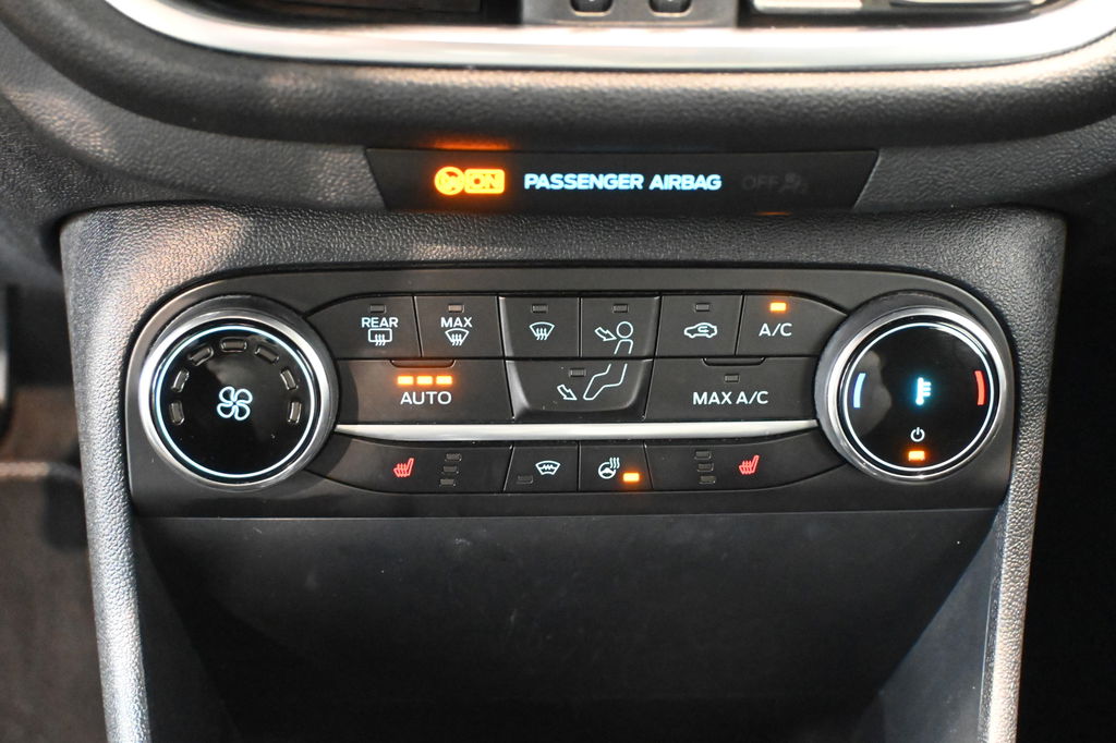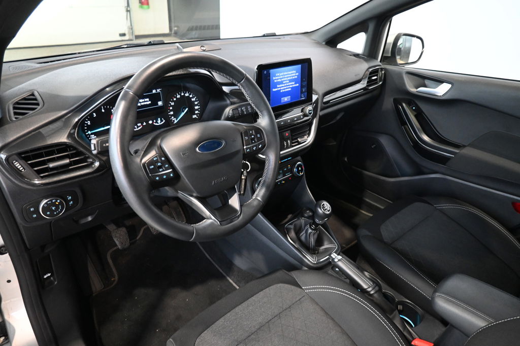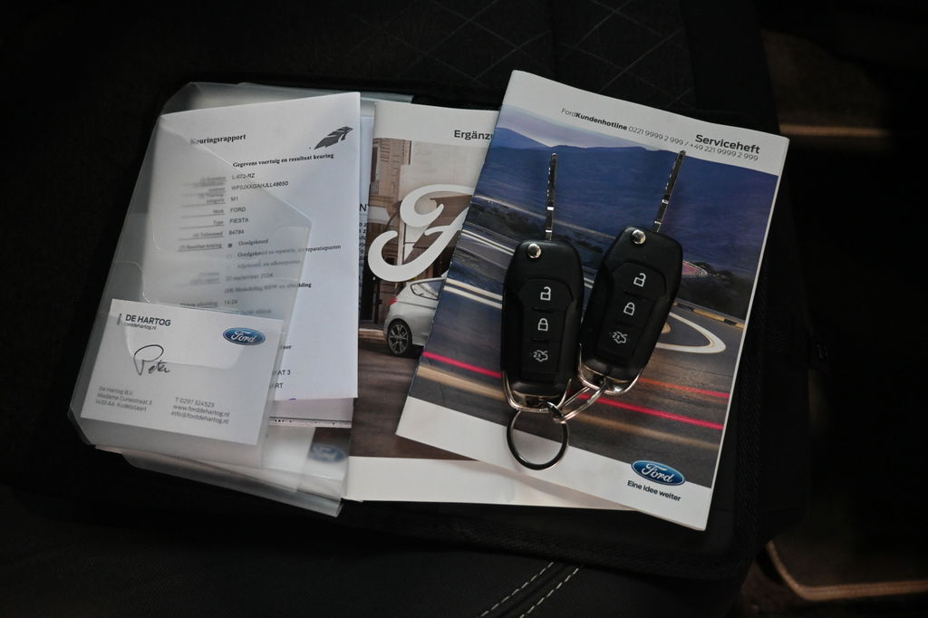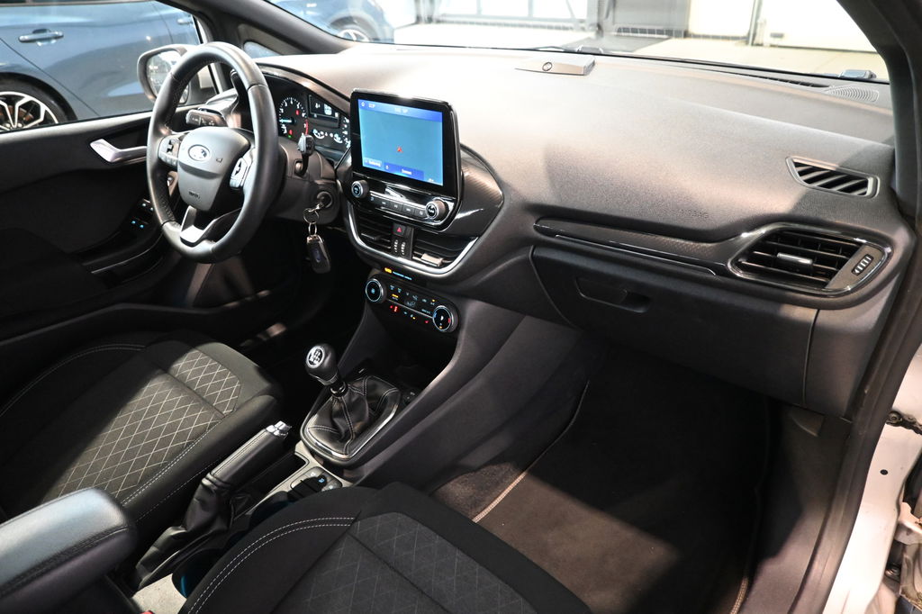Pragmatisch en veilig als deze auto is, beschikt hij over diverse veiligheidssystemen. U rijdt ook veiliger omdat deze auto voor u de verkeersborden langs de weg kan lezen. De belangrijkste borden worden op uw instrumentarium geprojecteerd, zodat u ze niet kunt missen. Deze Ford Fiesta is ook behulpzaam als het gaat om een rechte koers. Het Lane-keeping systeem signaleert en corrigeert als u onbedoeld de rijstrooklijnen dreigt te overschrijden. Op lange ritten voorkomt de vermoeidheidsassistent dat uw concentratie afneemt. Verder is deze auto uitgerust met hill hold functie, brake assist en bandenspanningcontrolesysteem.
