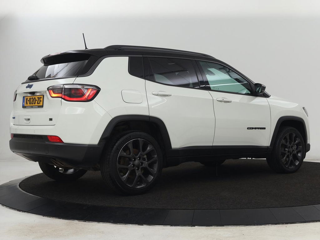 U rijdt gemakkelijk, comfortabel en zonder zorgen met deze Jeep Compass. Het is een auto van het bouwjaar 2021. De hybride motor combineert een elektromotor met een verbrandingsmotor. U kunt dus kiezen. Het lederen interieur springt meteen in het oog; maar wat dacht u van het ultragemakkelijke elektrisch bediende glazen panorama dak en de elektrisch bedienbare achterklep? Behaaglijk onderweg zijn? Als bestuurder geniet u van de verwarmbare voorstoelen. Net als uw bijrijder! Als het buiten koud wordt, voelt zo'n verwarmd stuurwiel heerlijk aan. Dankzij de xenonverlichting profiteert u in het donker van een krachtige en heldere lichtbundel. In deze Jeep profiteert u onder andere ook van: 19 inch lichtmetalen velgen, extra getint glas, in delen neerklapbare achterbank, LED-achterlichten, verstelbare lendensteunen en verwarmde ruitensproeiers.