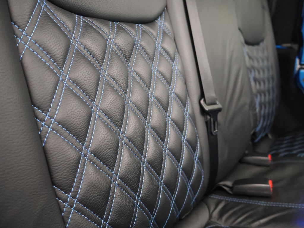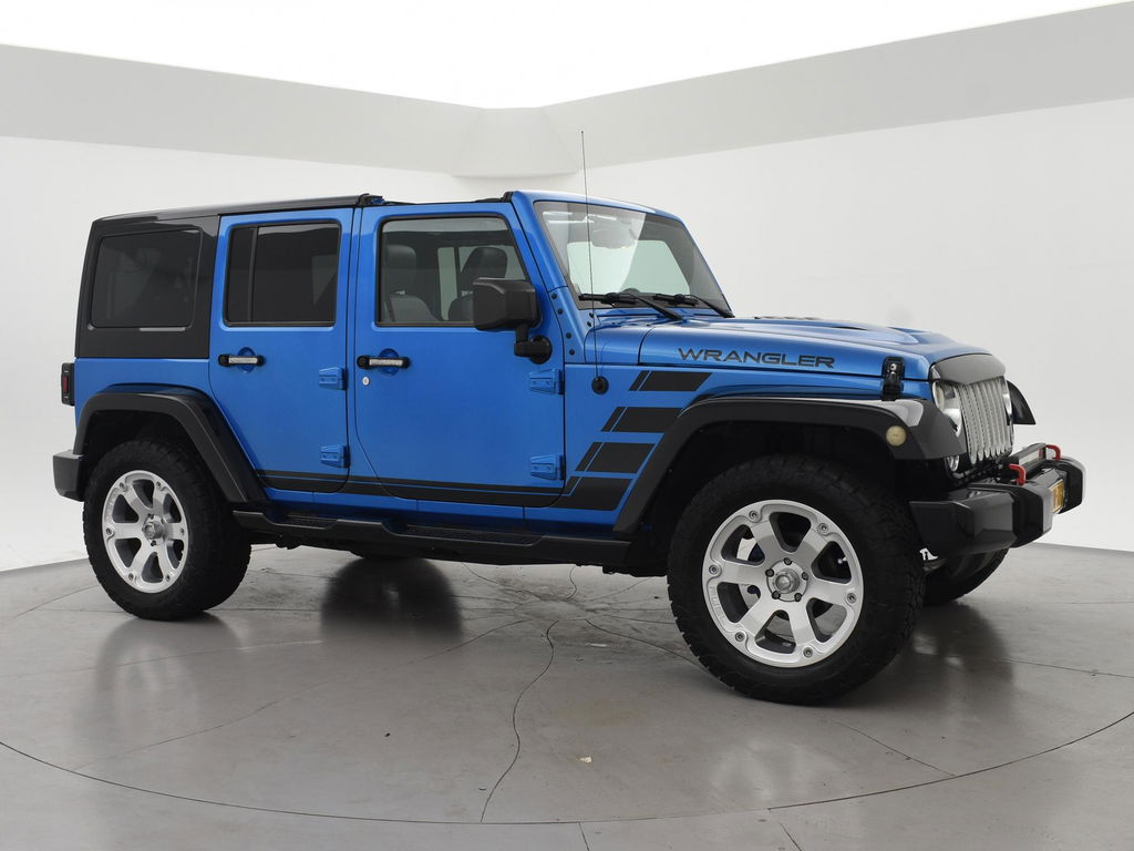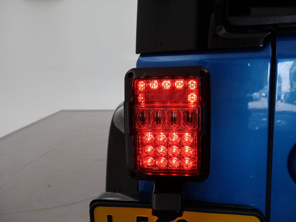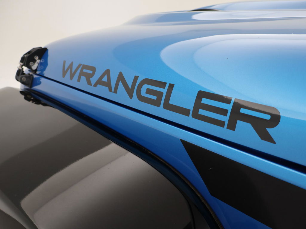 Wrangler Unlimited 5-deurs 3.6 Automaat 4X4 284 PK in de kleur Hydro Blue Pearl Coat met zwarte bumpers, zwarte spatbordverbreders, sidebars en dak, Hardtop en softtop allebei aanwezig, allebei zwart van kleur. Zwart volledig leder interieur met blauw stiksel, Apple Carplay / Android Auto appstreaming Google Maps, Apple Kaarten / Navigatie, Spotify, Podcast en radio apps, Whatsapp, Flitsmeister en vele andere apps, Phoenix Gold Premium audio met subwoofer in de achterdeur, 20 inch lichtmetalen velgen met grove All Terrain banden, Achteruitrijcamera, Cruise control, Airco, LED lichtbalk voorop, LED koplampen, LED achterlichten, Hardcover over het reservewiel, Blauwe sfeerverlichting interieur.
