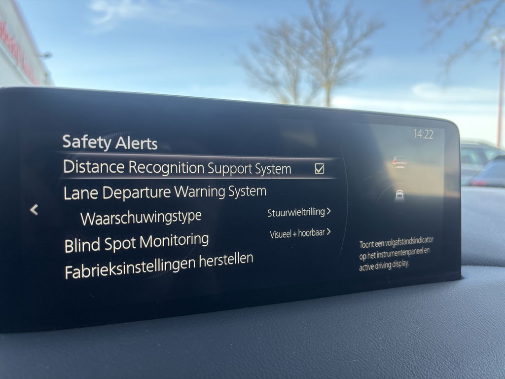 - Mazda Radar Cruise Control (MRCC): houdt ingestelde snelheid aan en bewaart gewenste afstand tot voorganger (incl. stop & go-functie)