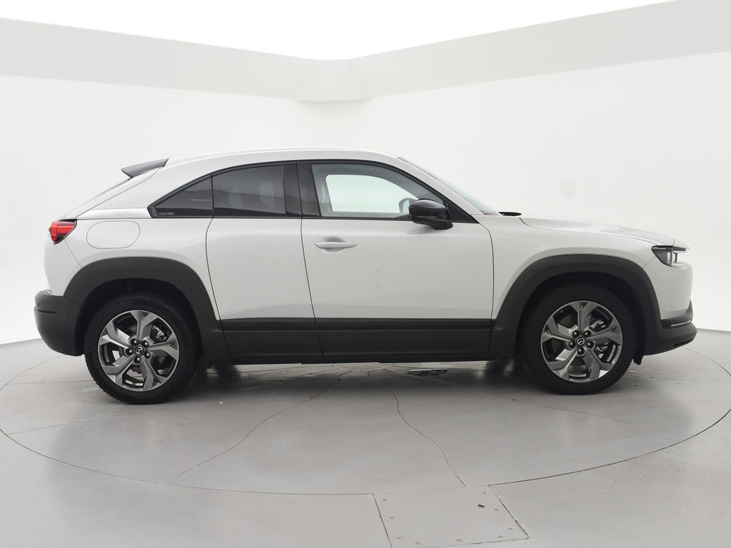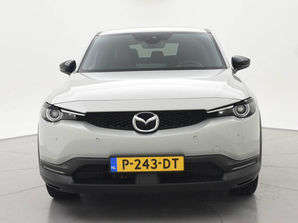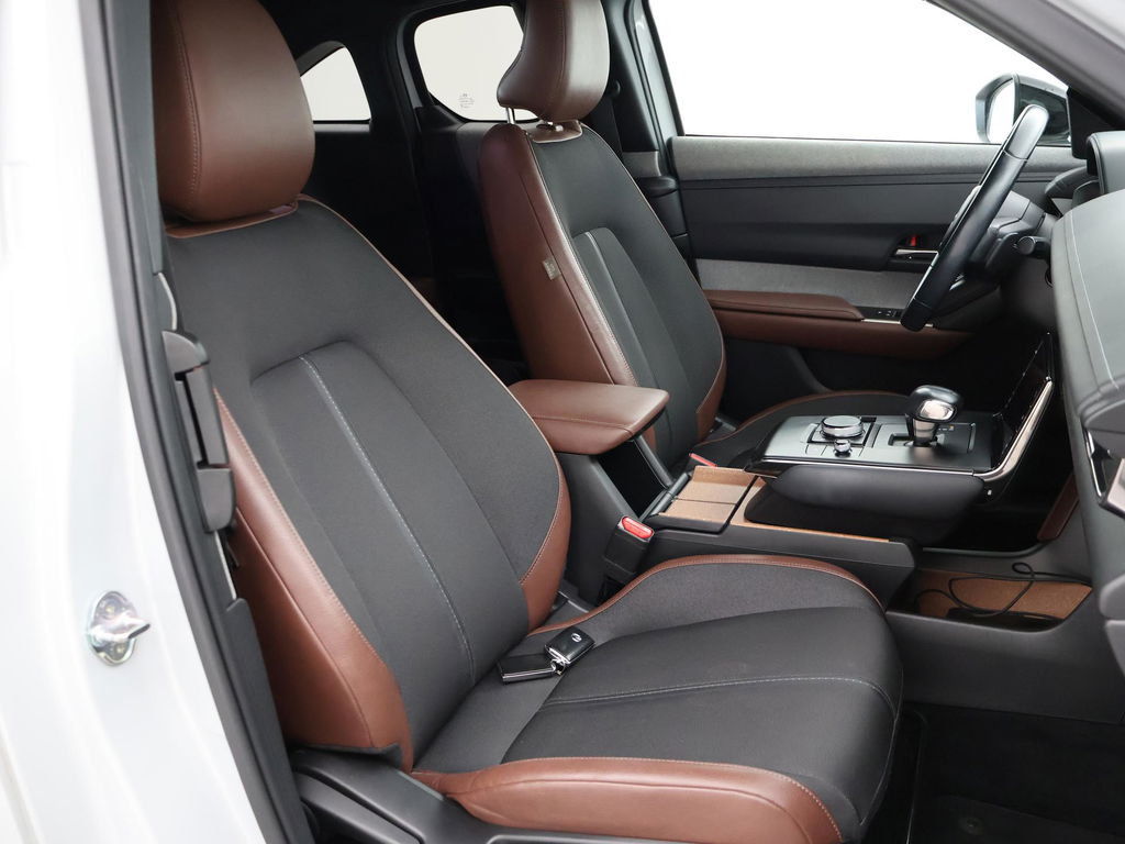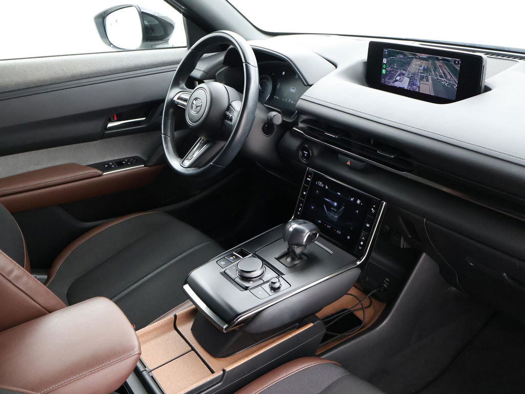 Volledig elektrisceh MX-30 in de First Edition uitvoering in het Ceramic Metallic met zwart/bruin half leder interieur, Elektrische stoelverstelling met geheugen, Head-up display, Breedbeeld Navigatie, Apple Carplay / Android Auto breedbeeld appstreaming Navigatie Google Maps, Spotify, Flitsmeister, Parkeersensoren voor + achter, Stoelverwarming, Adaptive cruise control, Elektrisch inklapbare buitenspiegels, Digitale tellers, LED koplampen, LED achterlichten, Climate control, Privacy glass.