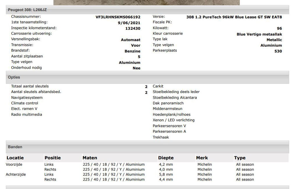 | Uitvoering: | SW 1.2 131PK GT Automaat / Distributie vv.bij 102.000KM / Trekhaak / 1/2 Leder / Pdc+Camera / Navi./ Xenon / / Apk 06-2027 |